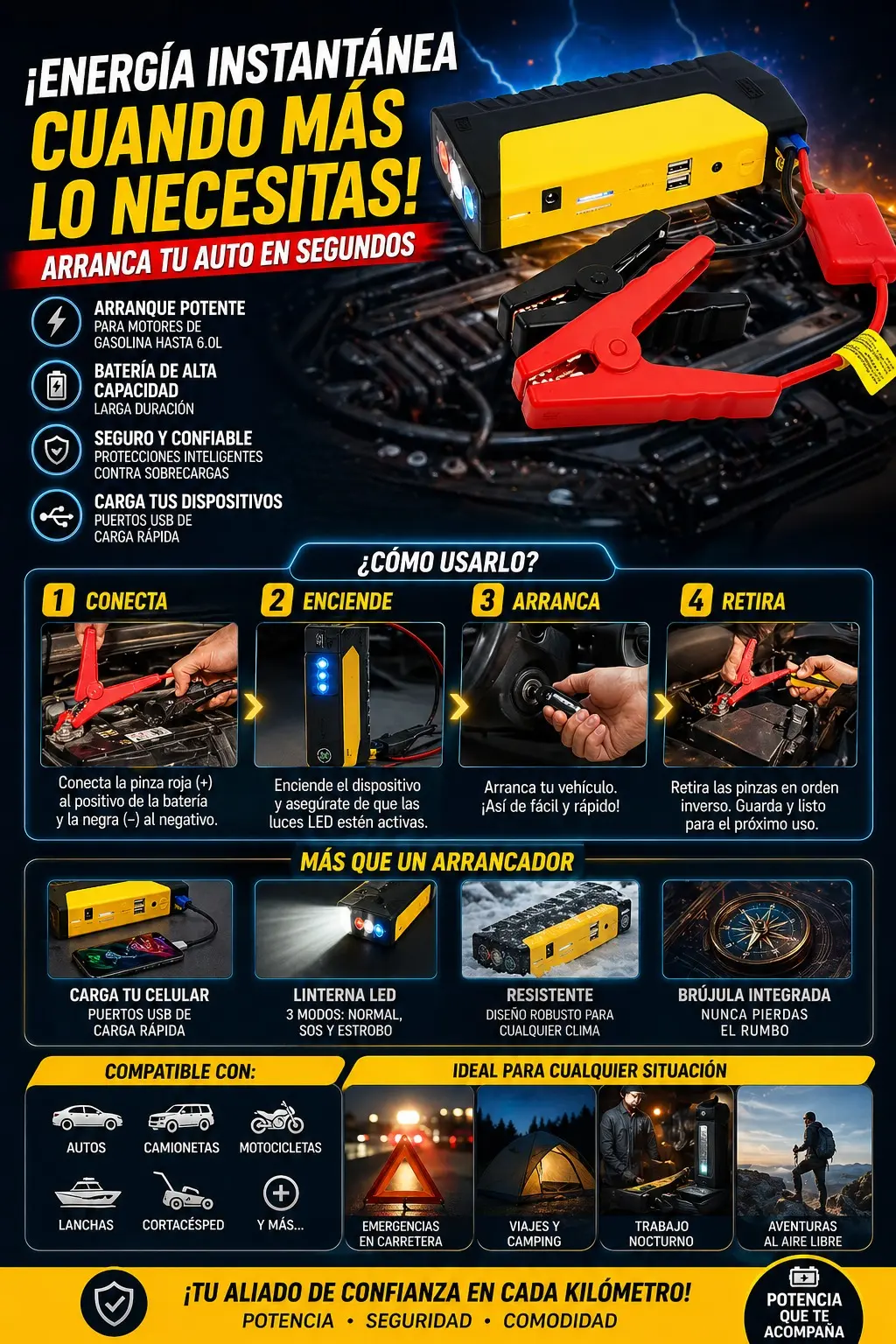 Porque una batería descargada no avisa. Tener este arrancador es llevar seguridad, energía y respaldo siempre contigo.