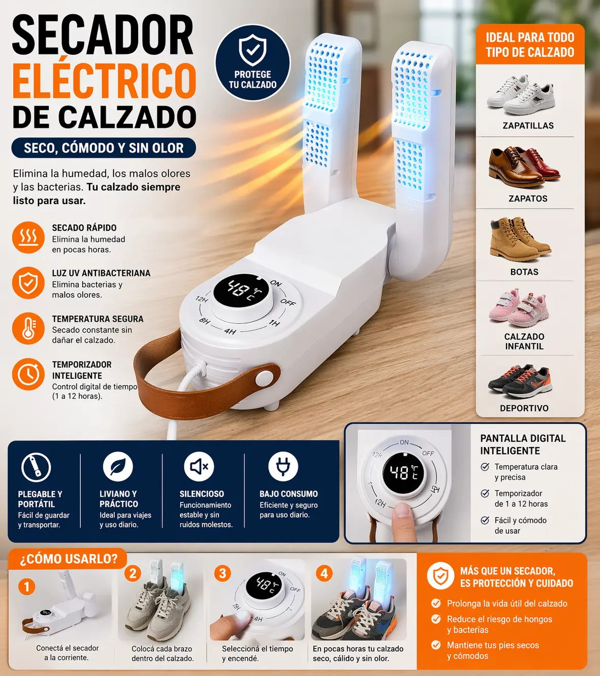 Gracias a su sistema de calor uniforme 360°, seca el interior del calzado sin dañarlo, ideal para días de lluvia, deporte o uso laboral intensivo.